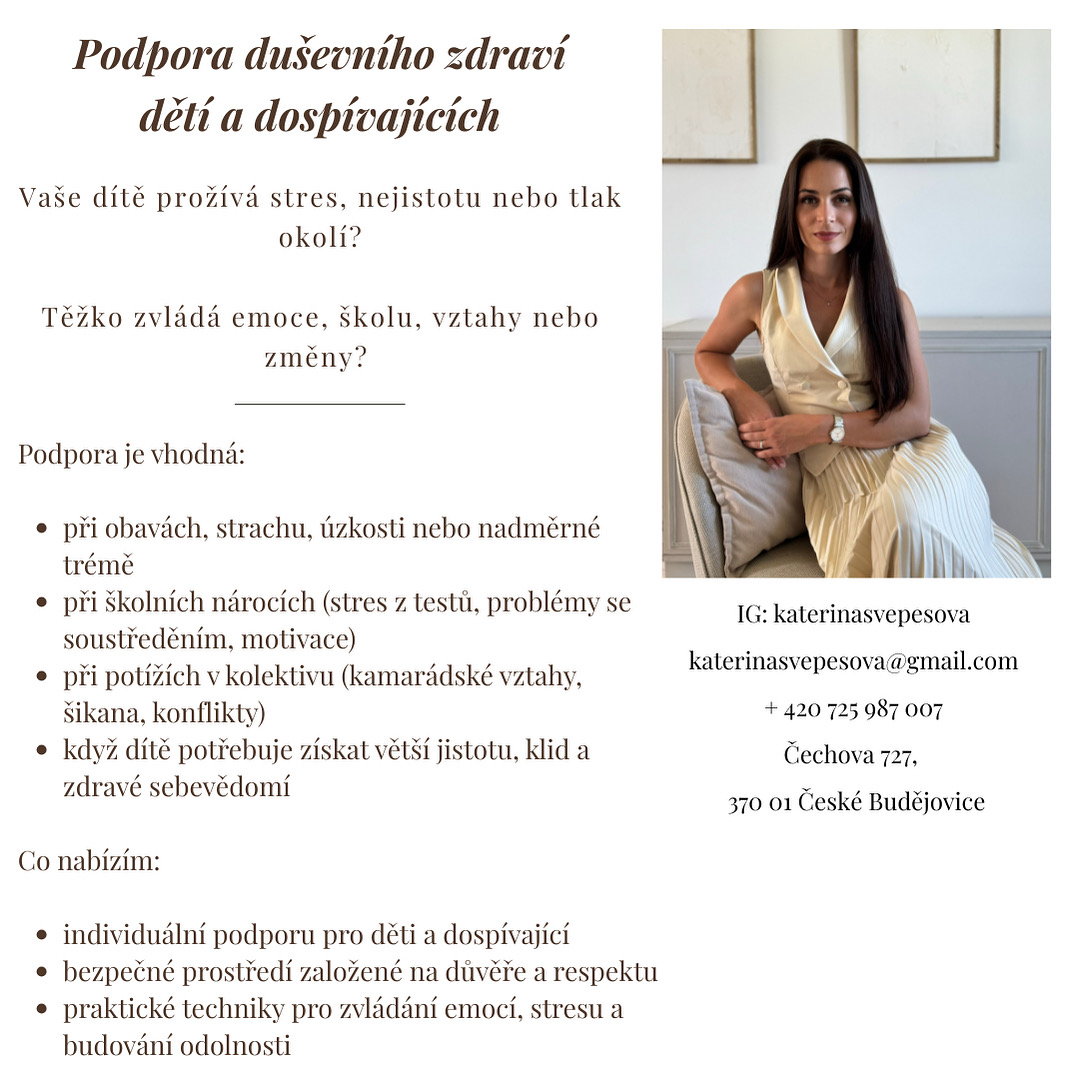 Neposkytuji terapii ani léčbu psychických poruch. V případě, že je potřeba odborná psychologická nebo psychoterapeutická podpora vždy doporučím odborníka, který může zajistit potřebnou pomoc.